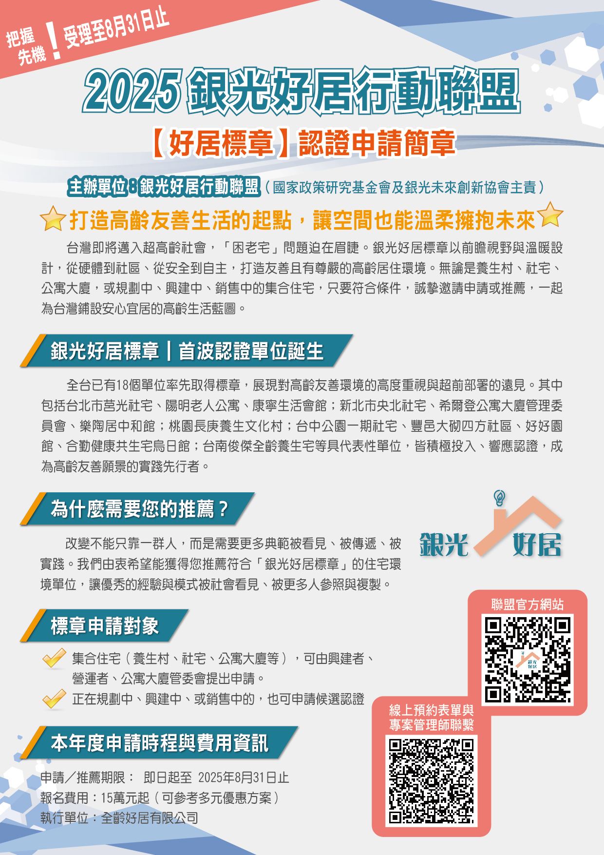 💡不論是集合住宅、公寓大廈、長照社區或養老村,都有機會成為「銀光好居」的標竿典範。