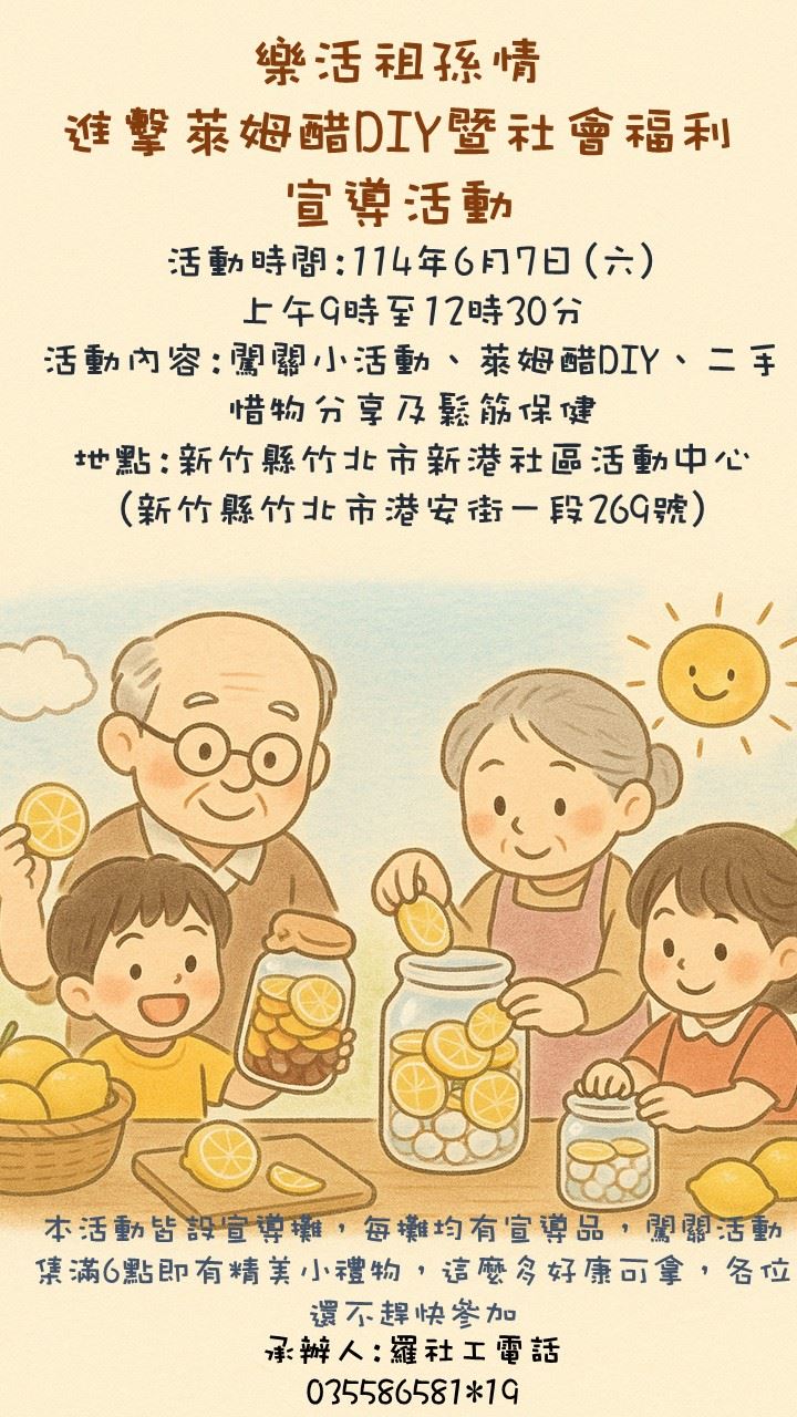 新竹縣竹北區社會福利服務中心串聯縣府社會、衛生、勞工等局處以及民間團體,將於6月7日(週六)上午9時至12時30分開出社福宣導列車停靠竹北市新港社區活動中心(竹北市港安街一段269號),以趣味闖關等方式讓縣民在遊戲中掌握社福大小事,並邀請親子一同體驗新港在地知名的萊姆醋DIY,活動免費參加,歡迎鄉親呼朋引伴共襄盛舉,享受歡笑、溫暖的社福嘉年華。