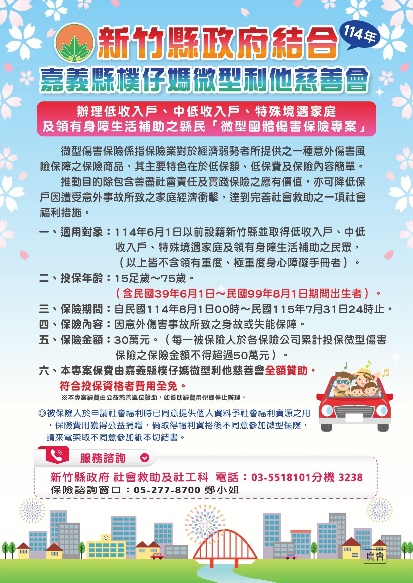 新竹縣政府攜手公益團體,自109年起推動「微型團體傷害保險」,針對15至75歲符合資格的縣民,提供免費意外傷害保障,最高理賠金額可達30萬元。今年縣府與嘉義縣樸仔媽微型利他慈善會,及全球人壽、第一產物、泰安產物、兆豐產物等保險公司合作,保障對象除低收入戶、中低收入戶與領有身心障礙生活補助的縣民外,特別將特殊境遇家庭也納入,共有6078人受惠。
