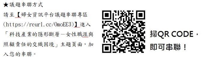 本次議題串聯文章,公布於《婦女服務資訊平台》的議題專區(https://reurl.cc/OmoEE3),邀請民眾與各界團體上網加入串聯並凝聚多元聲音,期能讓社會共同思考如何打造兼顧性別平權與友善照顧的職場環境,讓更多民眾與團體了解女性在科技產業所面臨的困境。