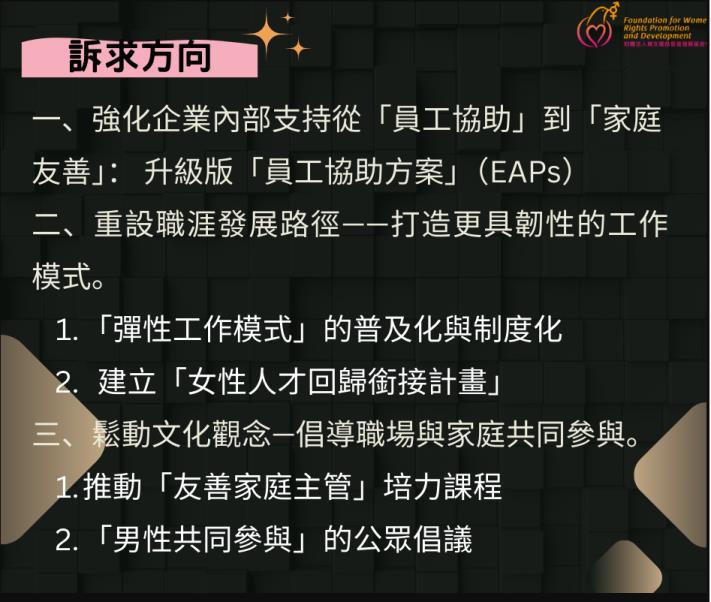 針對訪談結果,北區婦女福利服務中心指出,女性婚育後常因育兒與長輩照顧責任被迫調整或中斷職涯,尤其在高強度的科技業更為明顯,而制度、企業文化及公共資源不足,更讓女性職涯不平等的現象持續存在。