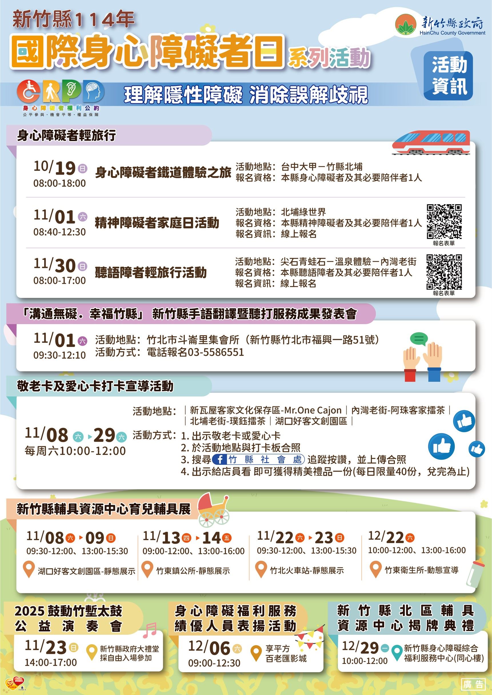 新竹縣政府為落實身心障礙者權利公約(CRPD)促進身心障礙者社會參與及社會融合之精神,並響應2025年國際身心障礙者日「理解隱性障礙、消除誤解歧視」主題,運用公益彩券盈餘分配基金辦理114年國際身心障礙者日系列活動,展現縣府對身心障礙者權益與共融社會的重視。