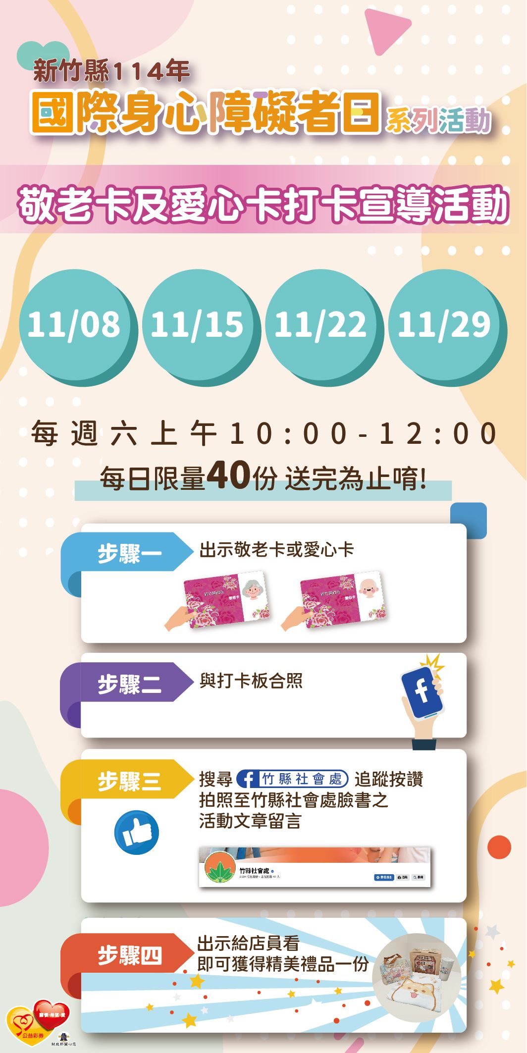 新竹縣政府自11月8日起,每週六舉辦「敬老卡及愛心卡打卡宣導活動」,凡持本縣愛心卡及敬老卡者,至湖口好客文創園區、新瓦屋客家保存文化區、內灣老街及北埔老街等四處指定地點與打卡板合照,上傳本府社會處臉書並按讚分享,即可獲得好禮一份,每日每點限量40份,兌完為止;系列活動豐富且有趣,詳細資訊歡迎上本府社會處網站查詢。