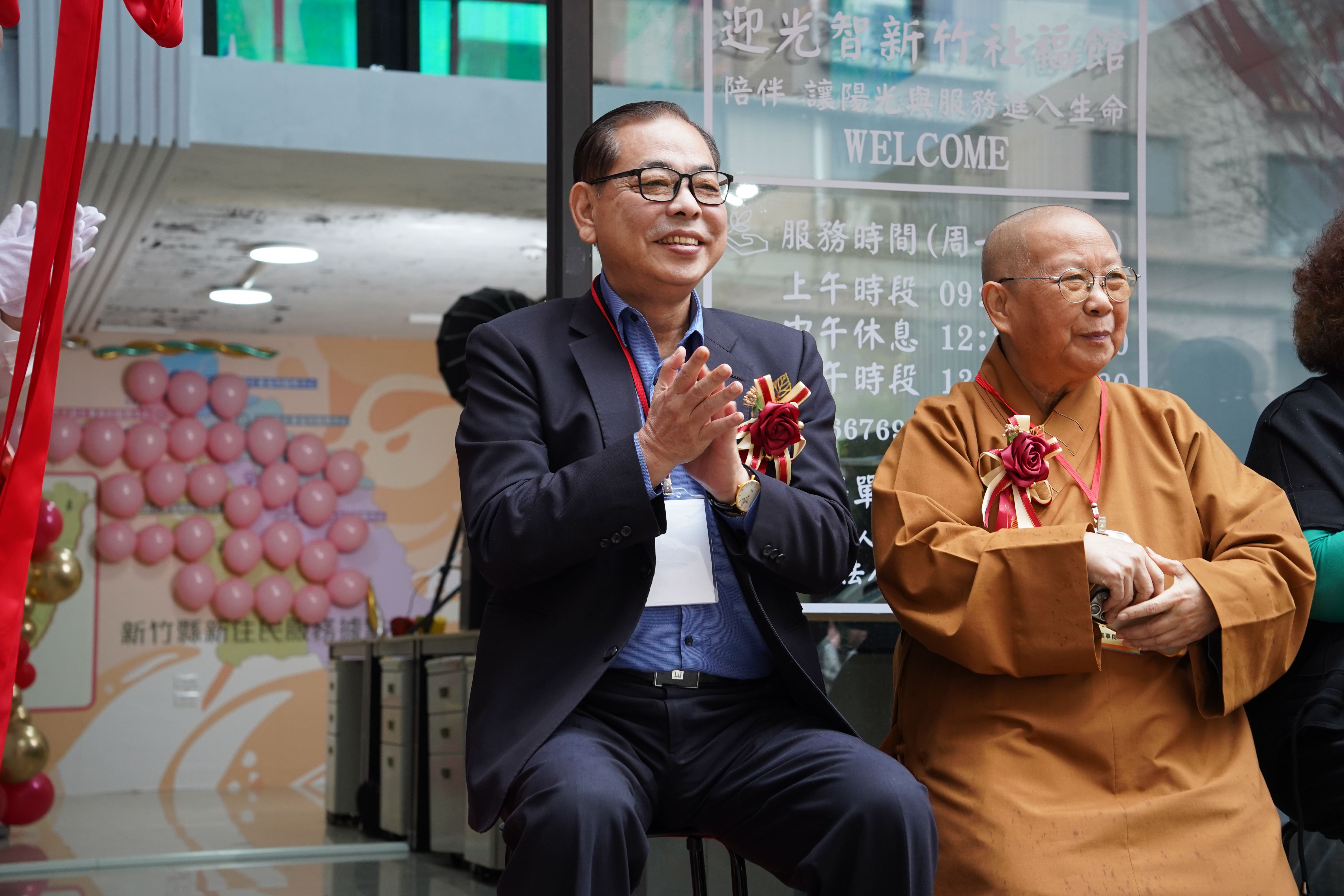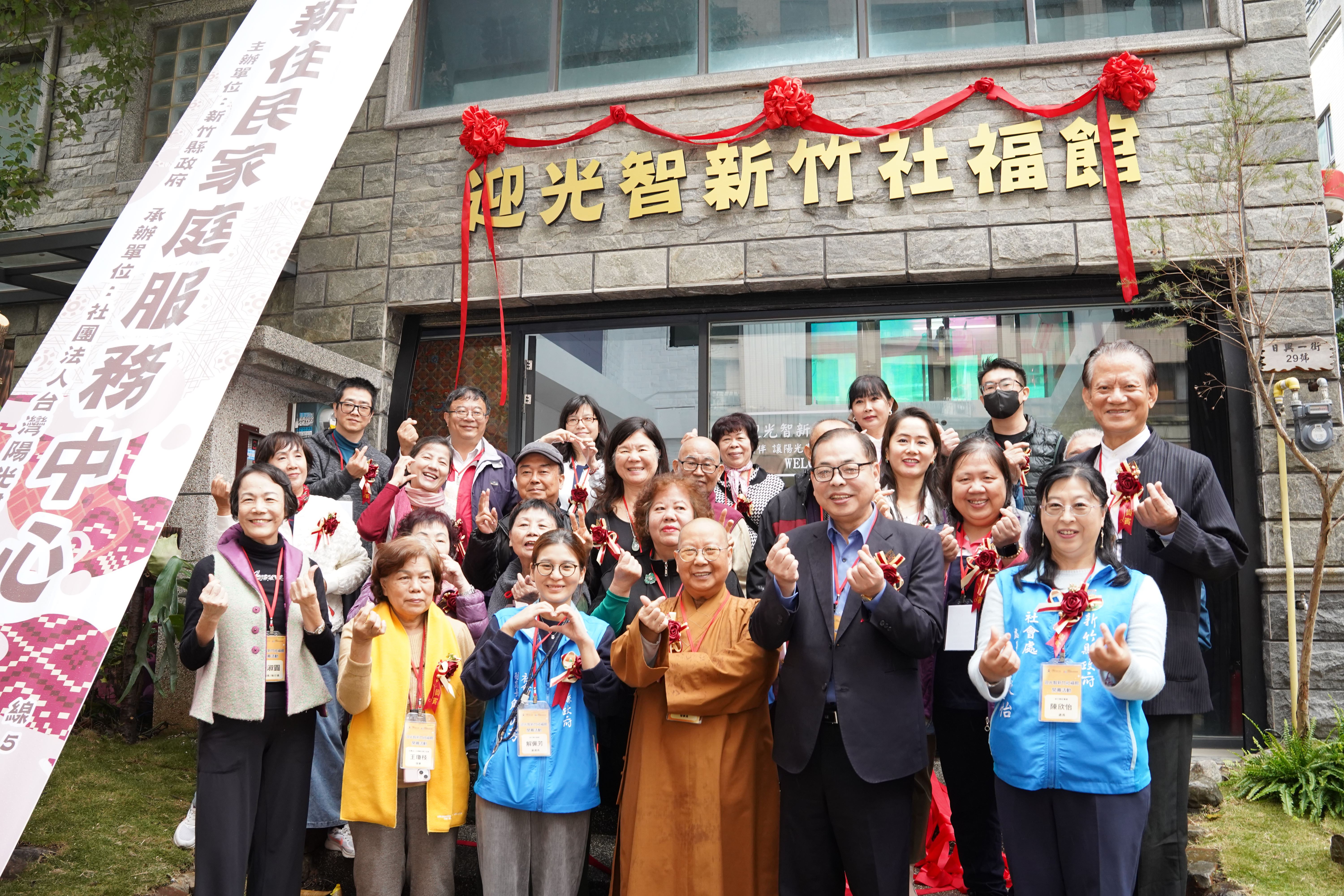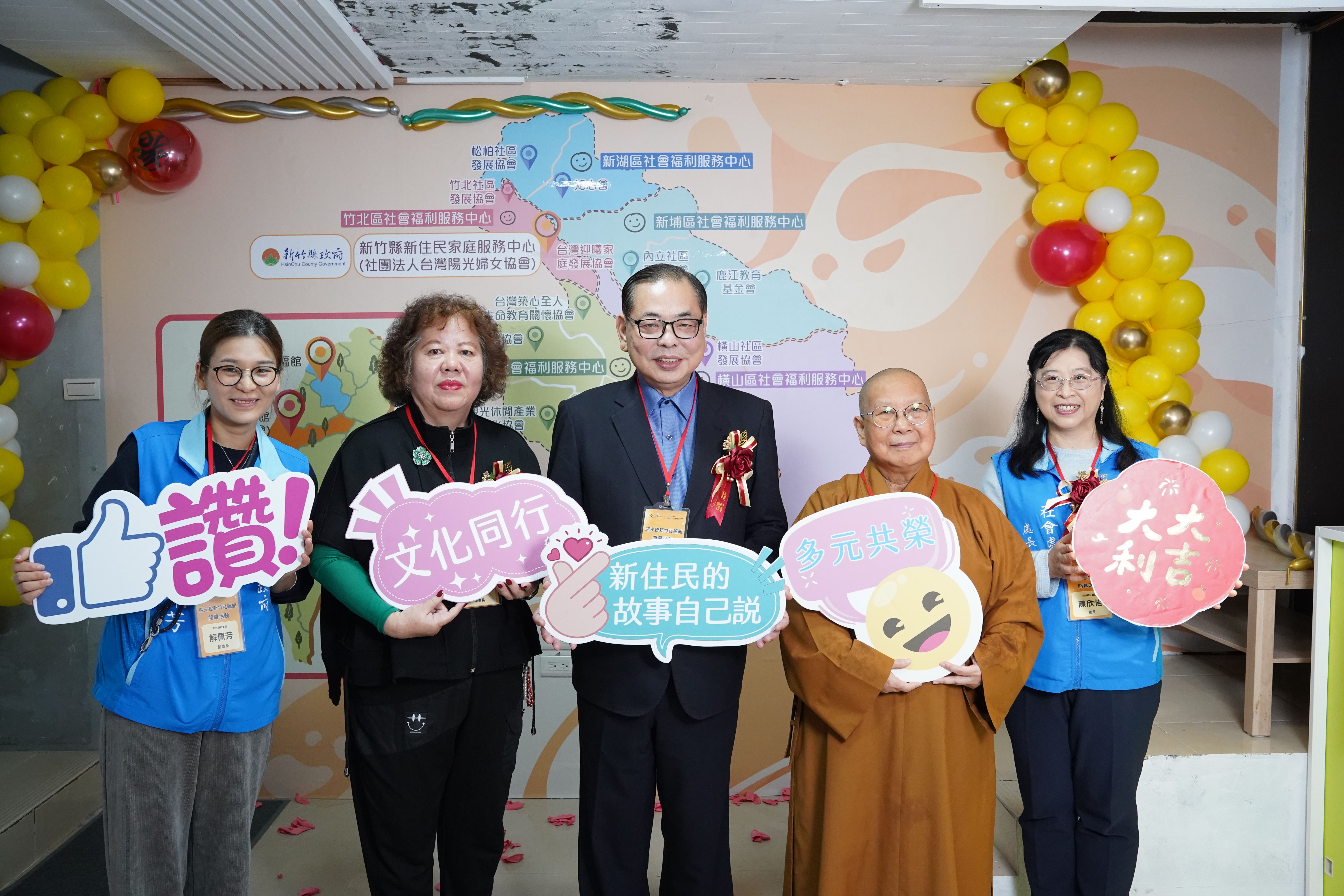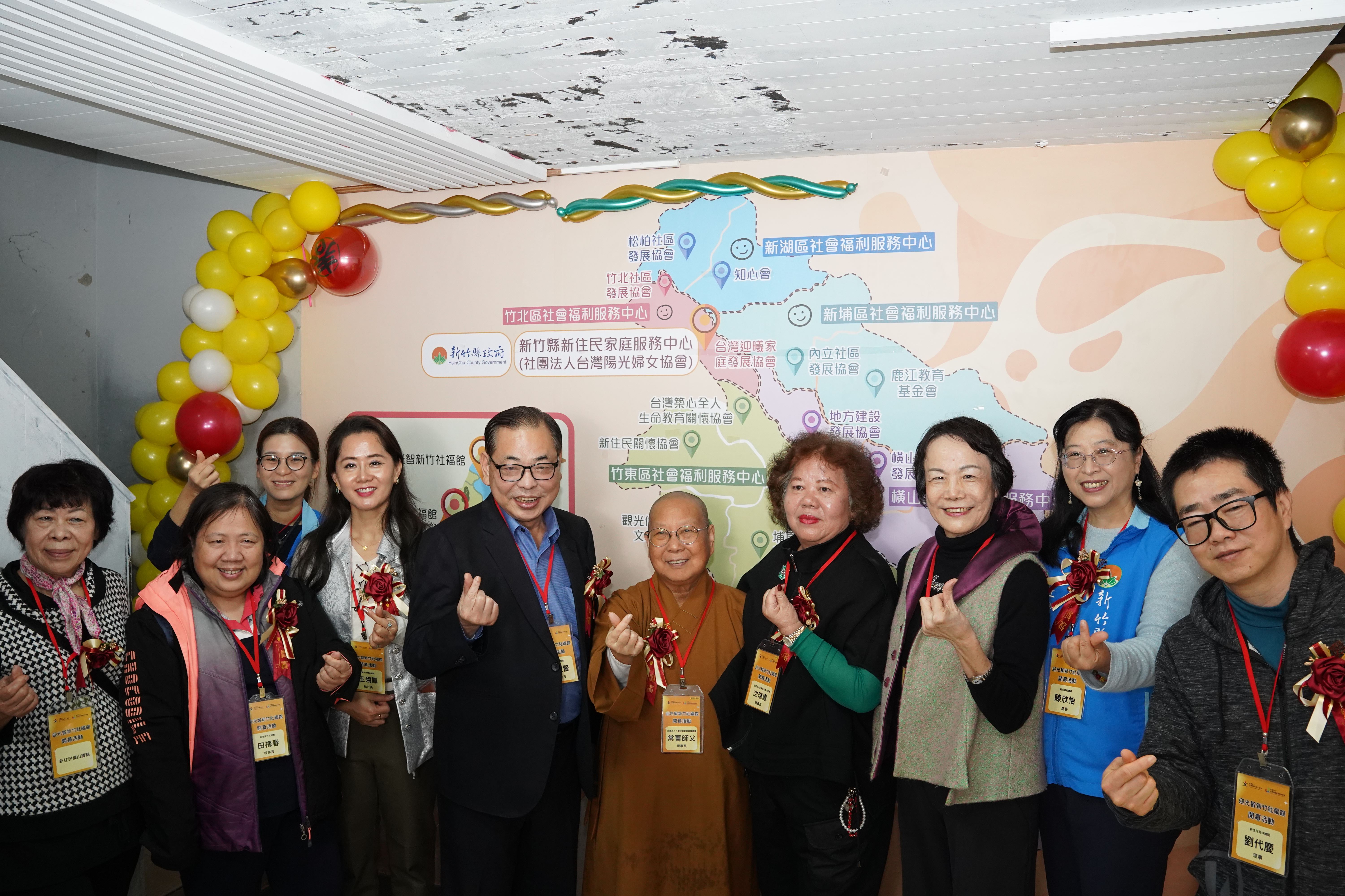 社團法人台灣迎曦家庭發展協會理事長釋常菁、社團法人台灣陽光婦女協會理事長沈瑞鳳、秘書長陳淑圓等人與新竹縣12鄉鎮據點夥伴,共同見證新住民家庭服務中心揭牌啟用。