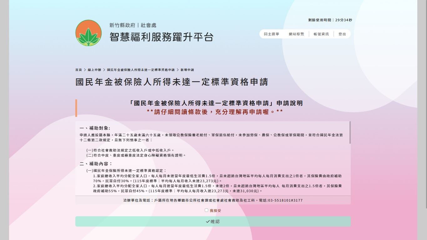 縣長楊文科表示,縣府秉持「簡政便民」的理念,提供各項數位化服務,此次國民年金「所得未達一定標準保費補助」線上申請服務,民眾可使用電腦、平板或行動電話連結至「新竹縣智慧福利服務躍升平台」(https://smart-welfare.hsinchu.gov.tw/people/member/login),註冊會員帳號並登入系統,填妥資料並上傳身分證、相關證明文件電子檔,按下送出即完成,省去民眾舟車勞頓之苦。