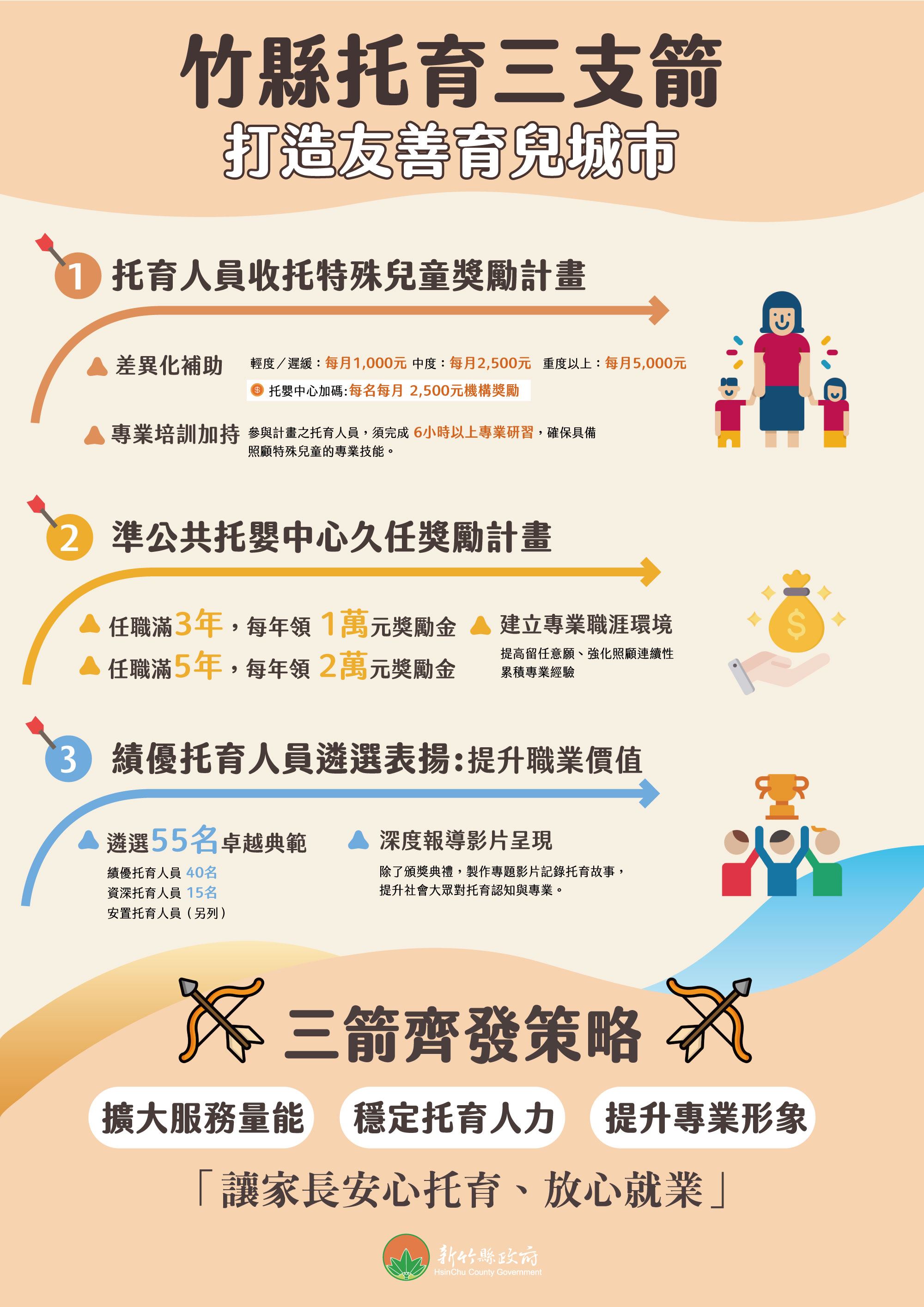兒童節即將來臨,新竹縣長楊文科宣布三項托育支持政策,透過制度獎勵與專業培訓雙軌並行,全面提升托育服務量能與品質。4月1日起縣府社會處推出「托育人員收托特殊兒童獎勵計畫」,依照障別等級托育人員每名每月最高補助5000元。今年也將舉辦「績優托育人員遴選表揚活動」,並配合已實施的「準公共托嬰中心托育人員久任獎勵計畫」,盼三箭齊發打造更友善的托育環境。